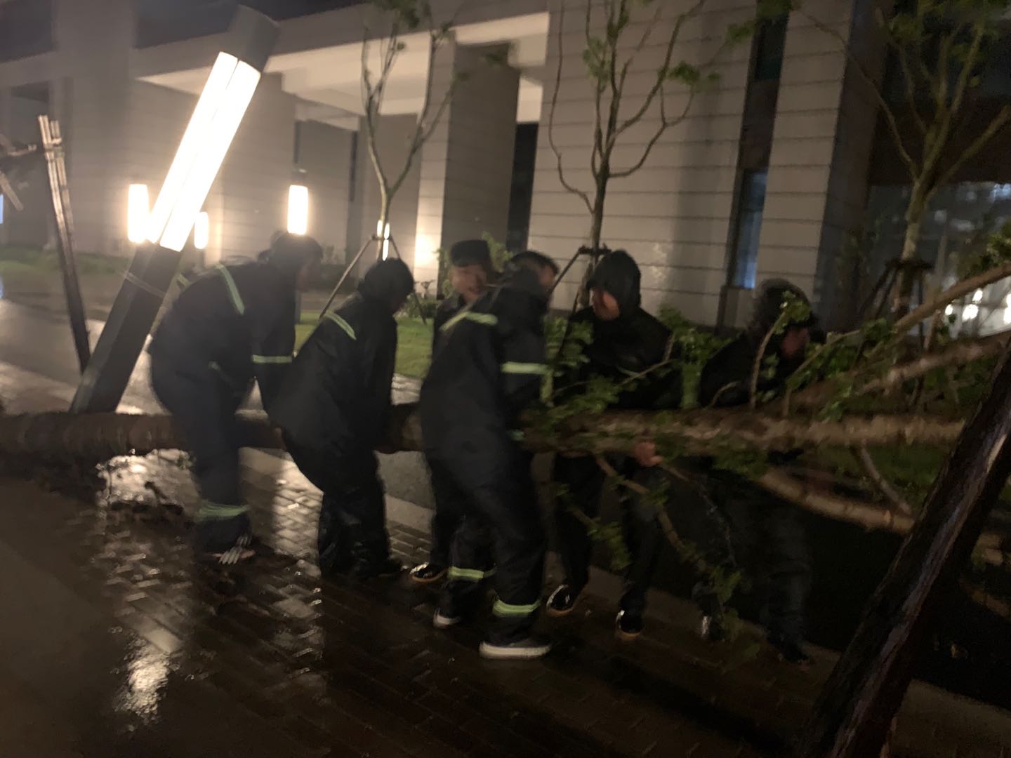 入夜后,风雨更甚,校内绿化、餐饮、维保人员全部被安置到学校临时安置点内。工作人员彻夜巡查情况,发现险情,立即排除。临港校区树木大多于去年新植,生根未牢,截至8月10日8:00,临港校区23棵树木被大风刮倒,两根路灯亦由于树倒被累及,巡视人员发现一棵,立即移开一棵,确保不发生后续险情。专人负责巡查各排水口,在“立奇马”台风肆虐过程中,整个校区未出现大面积积水现象。
