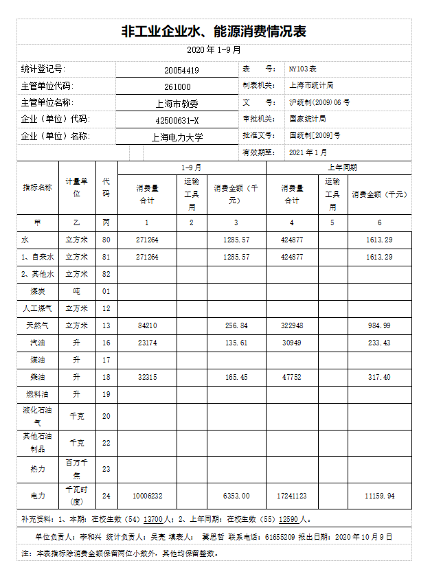 2020年第三季度非工业企业水、能源消费情况表