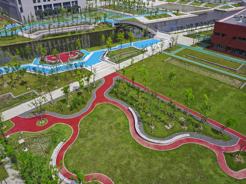上海电力大学临港校区是上海首个海绵示范校园,将低影响开发(LID)融入景观设计,实现校园自然积存、自然渗透、自然净化的海绵功能目标。运用“渗、滞、蓄、净、用、排”的海绵技术手段,实现校园内的良性水文循环,提高对径流雨水的渗透、调蓄、净化、利用和排放能力,维持或恢复校园的“海绵”功能,使天然降水发挥二次效用。