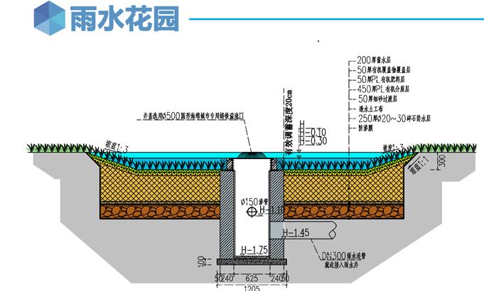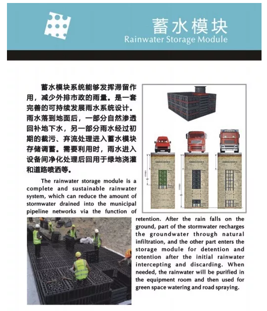 雨水系统主要由前置过滤器(大口径过滤器设备,内置独特三层过滤结构,过滤精度达 0.35mm,可拦截絮状物及直径大于0.35mm 的杂质,对汇流雨水进行初步过滤,使雨水杂质无法进入到雨水蓄水池)、雨水蓄水池(采用 PP 模块式蓄水池,蓄水率高达 95%,安装方便,承载力大,水池上方可做为绿地,种植花草和树木等)和雨水净化系统(采用多介质过滤器作为雨水处理的净化过滤及消毒系统)构成。校区东大道南侧停车场下设置 PP模块式雨水蓄水池,雨水通过卵石沟、植草沟、灌渠等方式汇入雨水花园,雨水花园种植灌木、花草、形成小型雨水滞留入渗设施,用于收集来自屋顶或地面的雨水,利用土壤和植物的过滤作用净化雨水。