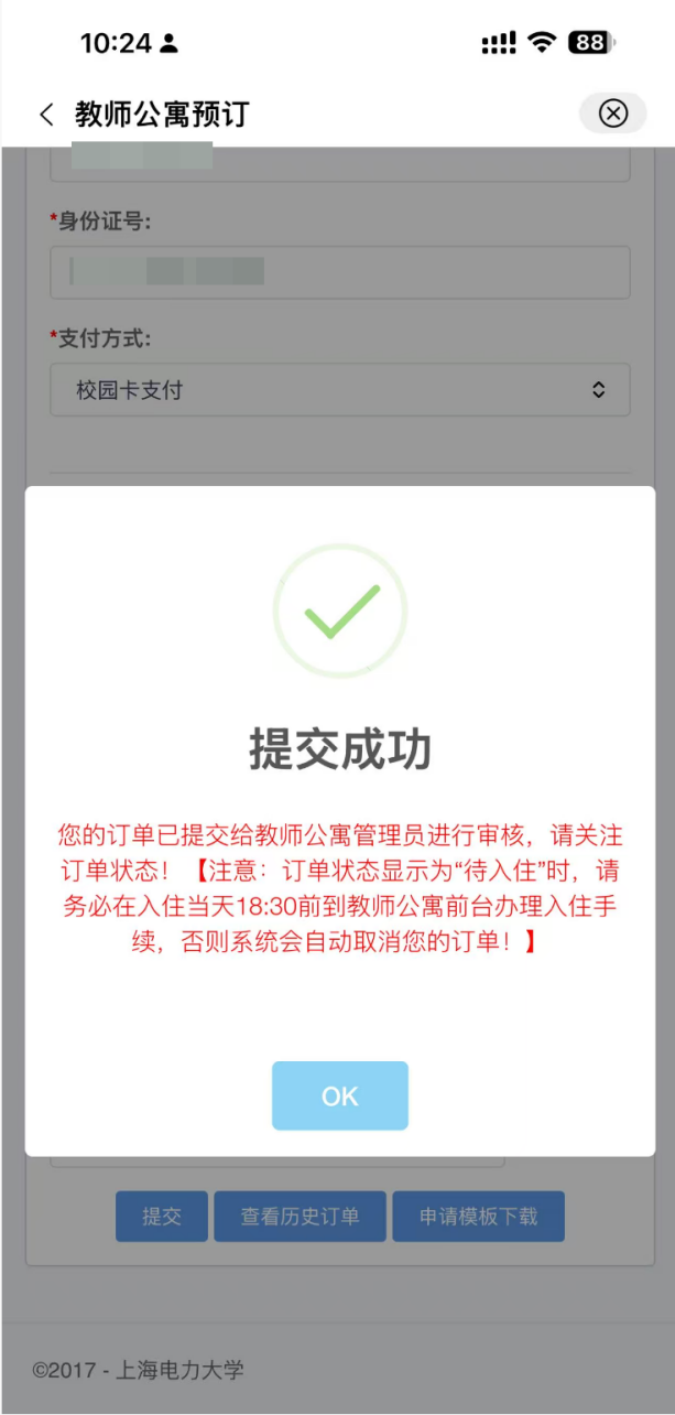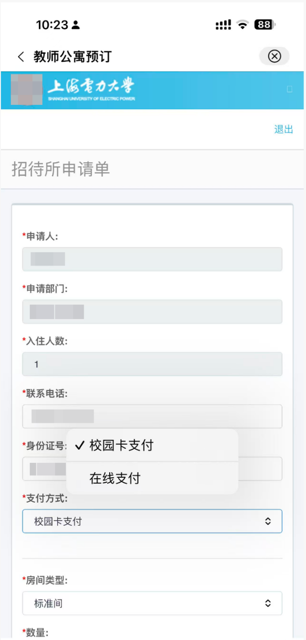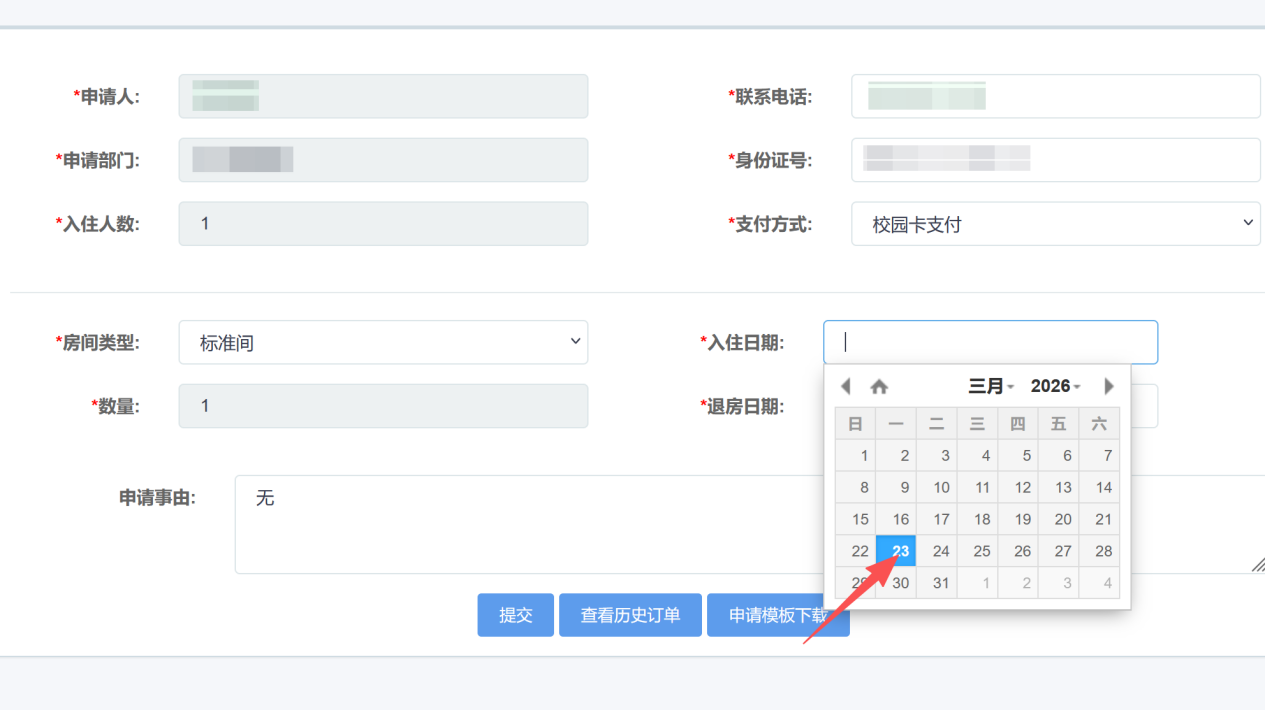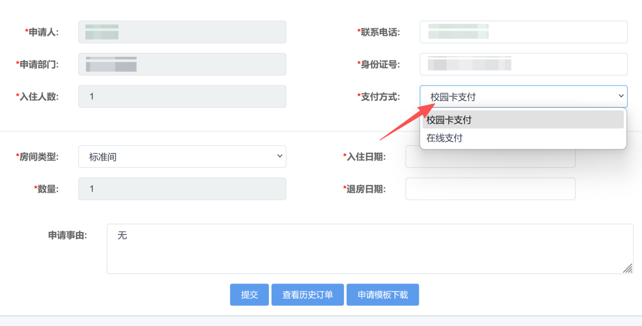 2、进入预定申请界面,选择支付方式、入住和退房日期,点击提交即可。随后可在我的申请里查看订单。