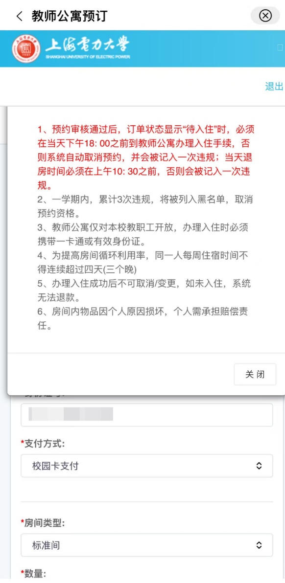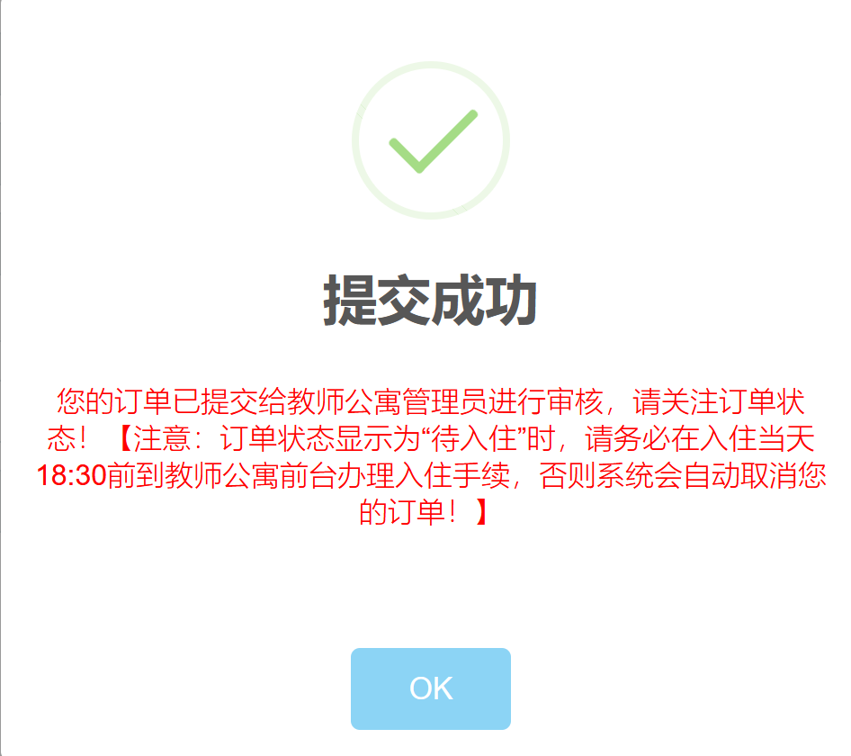 1、预约审核通过后,订单状态显示“待入住”时,必须在当天下午18: 00之前到教师公寓办理入住手续,否则系统自动取消预约,并会被记入一次违约;当天退房时间必须在上午10: 30之前,否则会被记入一次违约。