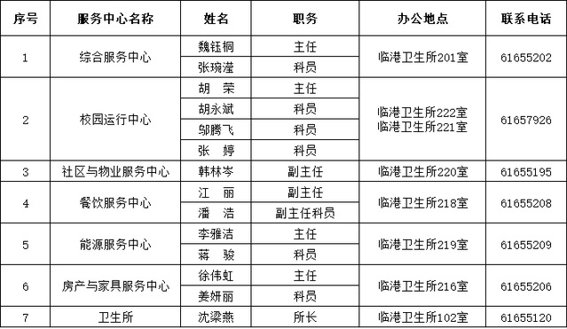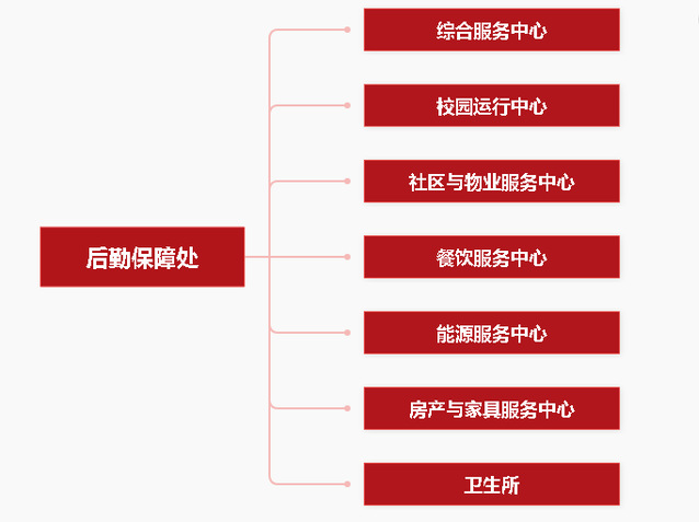 后勤保障处下设综合服务中心、校园运行中心、社区与物业服务中心、餐饮服务中心、能源服务中心、房产与家具服务中心、卫生所。